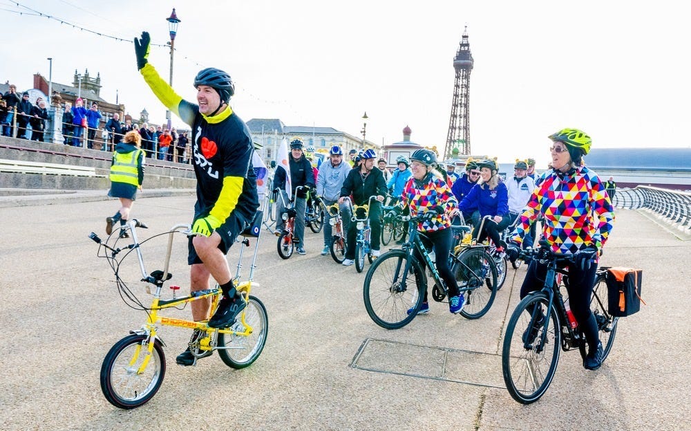 Paddy McGuinness was joined on his epic cycle challenge by Blackpool cyclists as he headed down the Prom.